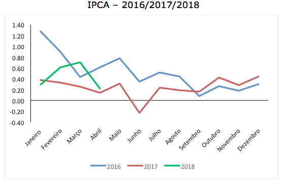 Ainda em relação ao IPCA, a inflação registrada em janeiro de 2018 foi menor do que a verificada em janeiro de 2017, porém em fevereiro e março de 2018 houve uma pequena aceleração inflacionária, para novamente declinar em abril. De janeiro a abril do ano corrente o acumulado do IPCA foi de 0,92%, pouco menor que o do mesmo período no ano passado (1,1%). Aqui se destacam os grupos: Educação (4,47%), Saúde e cuidados pessoais (2,19%) e Transporte (1,59%) com as maiores altas e Comunicação com uma deflação de (-0,24%).